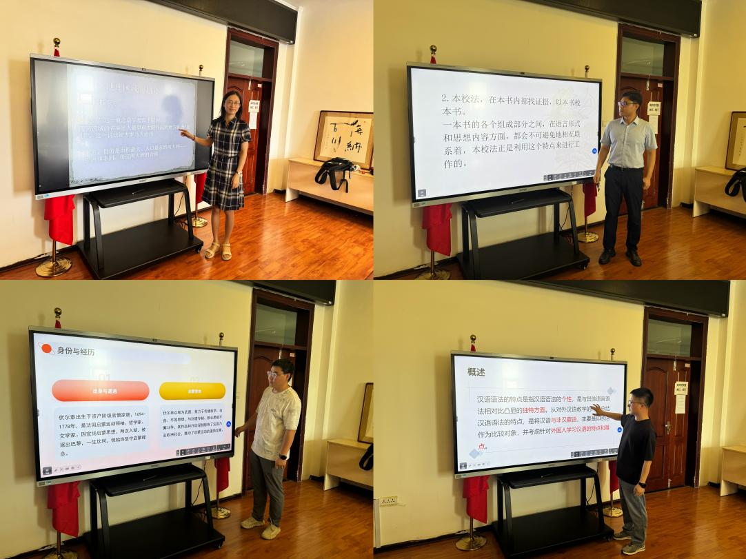 本次交流会分为新教师说课、导师经验分享、互动交流三个环节。新教师说课环节中,郭帅、杨帅、刘秀哲、郭黎婷四位新教师分别就自己所授的课程《文献校勘的方法》《汉语语法的特点》《伏尔泰的文艺思想》《东方文学》,从教学目标、教学内容、教学方法和教学过程设计等方面进行了详细阐述。他们的说课思路清晰、准备充分,展现了良好的专业素养和教学潜力。