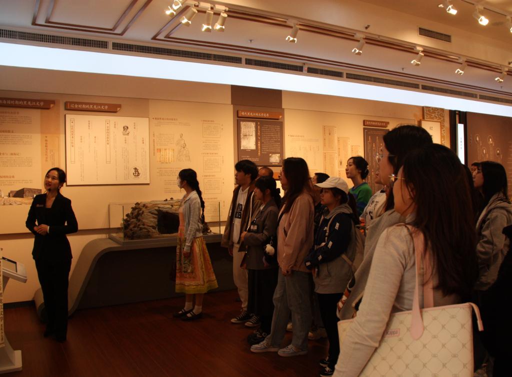 讲解人员首先引领师生们来到三楼,走进以木色为基调的主展厅,开启本次的文学之旅。以黑龙江古代文学板块为始,嘎仙洞的石室祝文、“海东盛国”的华章用苍劲的沉声歌吟着黑龙江流域古老的文学故事,这片冰雪天地在历朝都留下了文学的遗存,成为孕育龙江文学的丰沃土壤;跟随着讲解员的脚步一同走入黑龙江文学的近现代时期,在这一时期,这片黑土地上涌现出许多惊艳文坛的作家:萧红、萧军、舒群、金剑啸等。