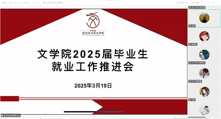杨鑫焱老师重点强调了毕业论文质量把控与答辩准备工作,毕业论文不仅是学术能力的检验,更是培养职业素养的重要契机。论文外审在即,杨鑫焱老师提示大家应以严谨态度按照导师修改意见认真完成毕业论文修改工作,为学术生涯和职业发展奠定坚实基础。杨鑫焱老师嘱咐大家,近期有很多事业单位发布招聘公告,大家在修改论文的同时,要抓住“金三银四”的重要时间节点,做好就业信息的搜集工作,根据自身实际情况进行理性的职业选择,鼓励大家坚定自信、持续提升综合能力,祝福大家顺利找到合适的职业方向。