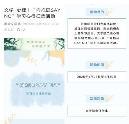“向拖延挥手SAY NO”学习心得征集活动以唤醒行动力为核心,通过互动分享与方法指导,助同学们剖析拖延成因、制定改进计划,在汲取力量中以阳光心态成长,携手绘制的“未来规划图”强化了时间管理能力,达成摆脱拖延、共绘美好未来的目标。