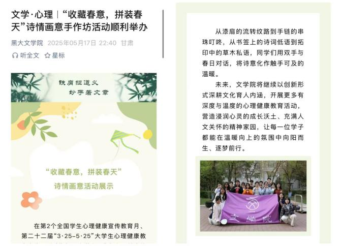 作为获批校级精品项目的“收藏春意,拼装春天”诗情画意手作坊活动,在活动开展过程中以漆扇绘制、手链编织、书签拓印等多元手作形式为载体,将传统文化创新转化为可触摸的美育体验,既让学子在指尖创作中感受春意具象化的美学魅力,又通过文化育人内核构建精神成长沃土。项目凭借“以美润心”的鲜明特色与广泛影响力,不仅收获现场参与者的热烈反响,更获心启航HLJU、Mksport体育视频号、龙江高校网络思政中心等平台专题推广。