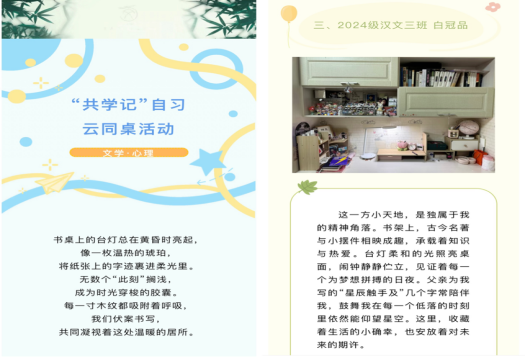 一方书桌一块天地,一盏灯光一种陪伴,共学记”自习云同桌活动鼓励同学们分享学习环境与感悟,在装点书桌中培养正确学习习惯、打造优良学风,这些精心打造的学习居所切实助力学子提升了学习效率,达成了以环境分享促进学风建设的目标。