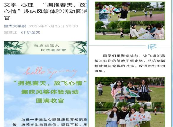同学们执画笔在风筝上描摹梦想形状,让色彩随笔尖绽成飞翔期待,在欢笑中推动了心理健康教育知识宣传,更以放飞风筝的形式让烦恼随风消散、让春日美好入怀,有效提升了同学们的情绪调节能力,切实达成了寓“心”于乐的目标。